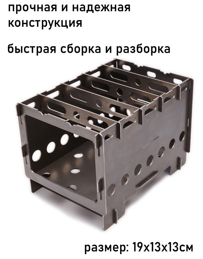 Надежная и удобная компактная печка щепочница на которой можно приготовить ужин, разогреть консерву и вскипятить чайник, при этом она неприхотлива к топливу и работает буквально на том, что лежит под ногами. В качестве топлива для этой печки-щепочницы используется практически любой горючий материал такой, который есть у Вас под ногами, к примеру шишки, веточки, щепки или сухое горючее, благодаря этому печку можно использовать в местах, где сложно найти дрова или их недостаточно. Конструкция мини печки проста, как все гениальное - пять пластин-стенок и несколько перемычек. Корпус металл 2мм с двойным дном и отверстиями в нижней части закрывает пламя от ветра и создает хорошую тягу. В результате готовить можно быстро и экономично. В разобранном виде печка занимает минимум места 19х13х1.5см, в собранном виде 19х13х13см весит с чехлом 1090г, при этом не нужно нести газовые баллоны или жидкое топливо.
